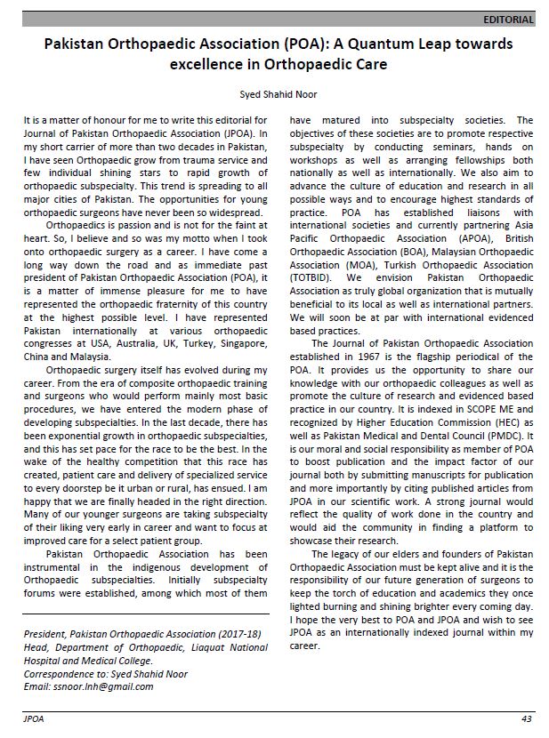 It is a matter of honour for me to write this editorial for Journal of Pakistan Orthopaedic Association (JPOA). In my short carrier of more than two decades in Pakistan, I have seen Orthopaedic grow from trauma service and few individual shining stars to rapid growth of orthopaedic subspecialty. This trend is spreading to all major cities of Pakistan. The opportunities for young orthopaedic surgeons have never been so widespread.