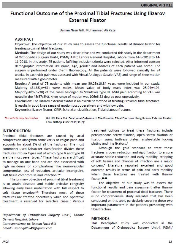 Functional Outcome of the Proximal Tibial Fractures Using Ilizarov External Fixator. (2019). Journal of Pakistan Orthopaedic Association, 31(02), 53-56. https://www.jpoa.org.pk/index.php/upload/article/view/311