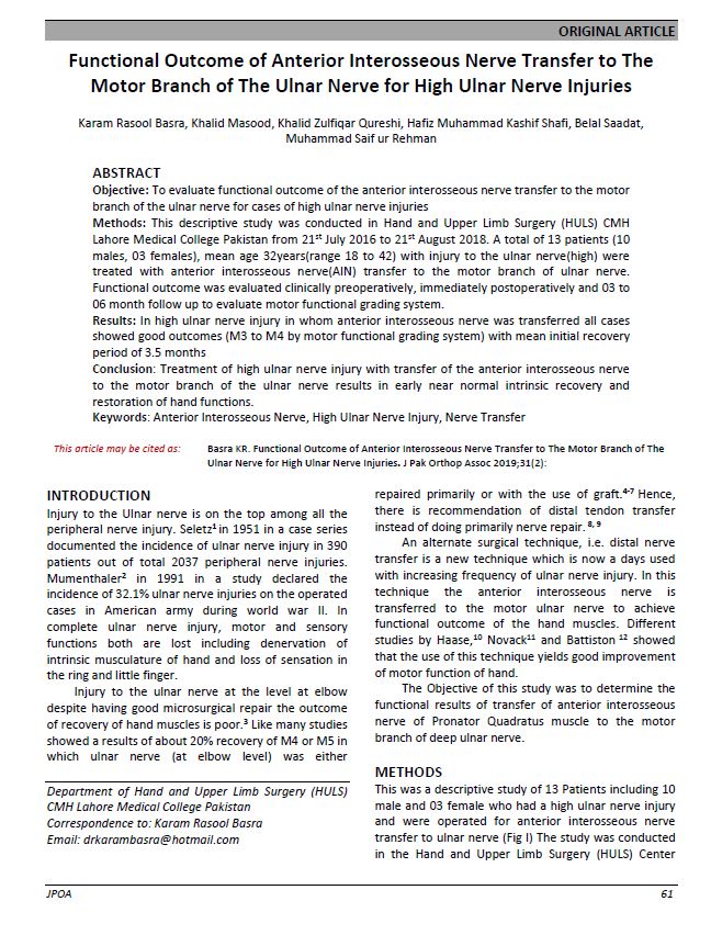 Methods: This descriptive study was conducted in Hand and Upper Limb Surgery (HULS) CMH Lahore Medical College Pakistan from 21st July 2016 to 21st August 2018. A total of 13 patients (10 males, 03 females), mean age 32years(range 18 to 42) with injury to the ulnar nerve(high) were treated with anterior interosseous nerve(AIN) transfer to the motor branch of ulnar nerve. Functional outcome was evaluated clinically preoperatively, immediately postoperatively and 03 to 06 month follow up to evaluate motor functional grading system.