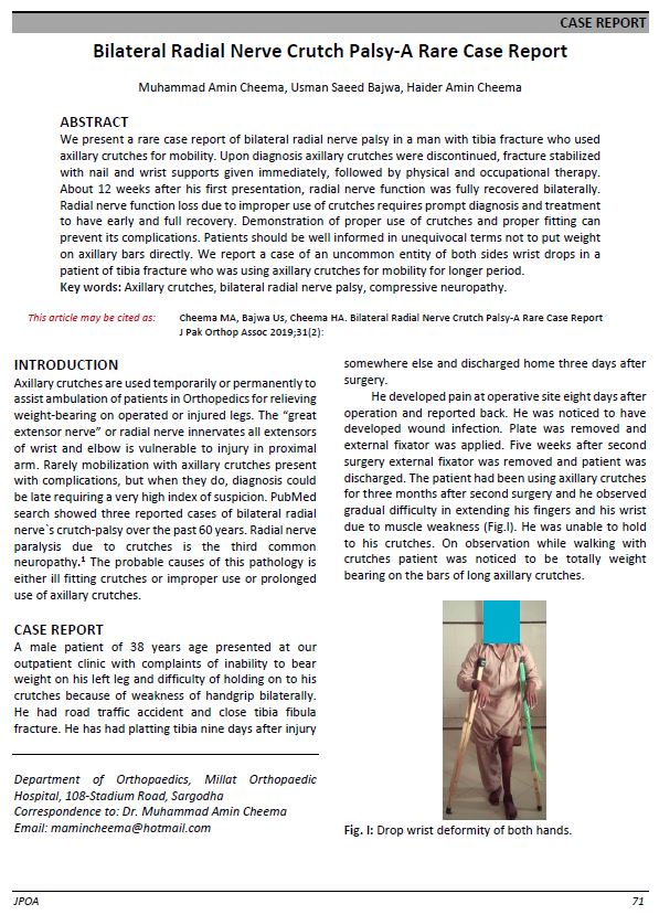 Bilateral Radial Nerve Crutch Palsy-A Rare Case Report. (2019). Journal of Pakistan Orthopaedic Association, 31(02), 71-73. https://www.jpoa.org.pk/index.php/upload/article/view/314