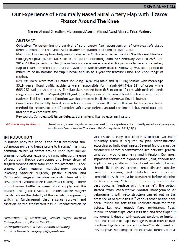 Our Experience of Proximally Based Sural Artery Flap with Ilizarov Fixator Around The Knee. (2019). Journal of Pakistan Orthopaedic Association, 31(02), 65-70. https://www.jpoa.org.pk/index.php/upload/article/view/317