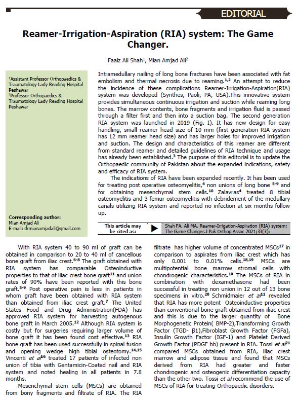 Reamer-Irrigation-Aspiration (RIA) system: The Game Changer. (2021). Journal of Pakistan Orthopaedic Association, 33(03), 87-89. https://www.jpoa.org.pk/index.php/upload/article/view/546