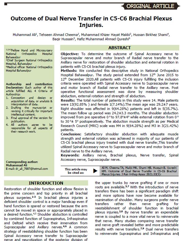 Outcome of Dual Nerve Transfer in C5-C6 Brachial Plexus Injuries. (2021). Journal of Pakistan Orthopaedic Association, 33(03), 107-111. https://www.jpoa.org.pk/index.php/upload/article/view/551