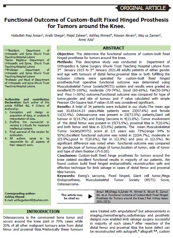Conclusion: Custom-built fixed hinge prosthesis for tumors around the knee yielded excellent functional results in majority of our patients. We found custom build fixed hinged endoprosthetic reconstruction safe and effective technique for limb salvage in cases of distal femur and proximal tibia tumors.