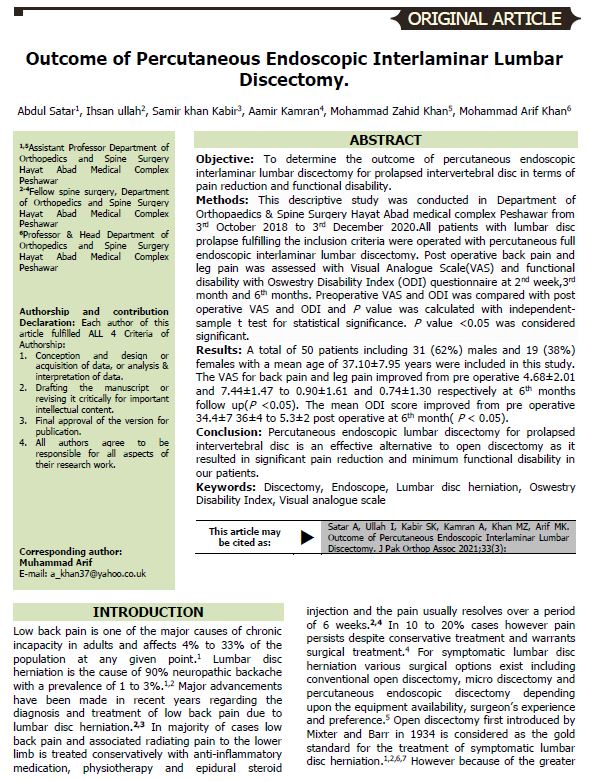Outcome of Percutaneous Endoscopic Interlaminar Lumbar Discectomy. (2021). Journal of Pakistan Orthopaedic Association, 33(03), 112-116. https://www.jpoa.org.pk/index.php/upload/article/view/554
