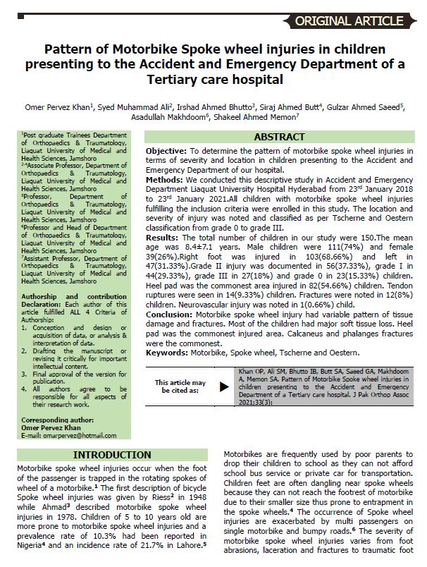 Naumeri F, Qayyum B, Cheema NI, Sohail M, Bashir MM. Motor cycle spoke wheel injuries in children: A preventable accident.Ulus Travma Acil Cerrahi Derg 2019;25:474-478.