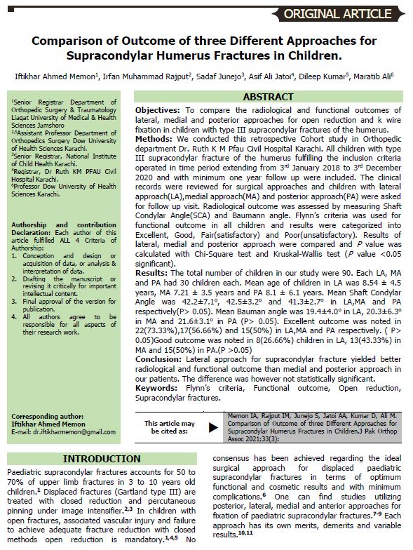 Orfi FA, Ahmad A, Saleem I, Orfi M.Supracondylar humerus fractures; comparison of lateral vs posterior approach in the management of supracondylar humerus fractures in children.Professional Med J 2019;26(04):545-549.