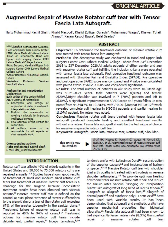 Augmented Repair of Massive Rotator cuff tear with Tensor Fascia Lata Autograft. (2021). Journal of Pakistan Orthopaedic Association, 33(03), 126-130. https://www.jpoa.org.pk/index.php/upload/article/view/557