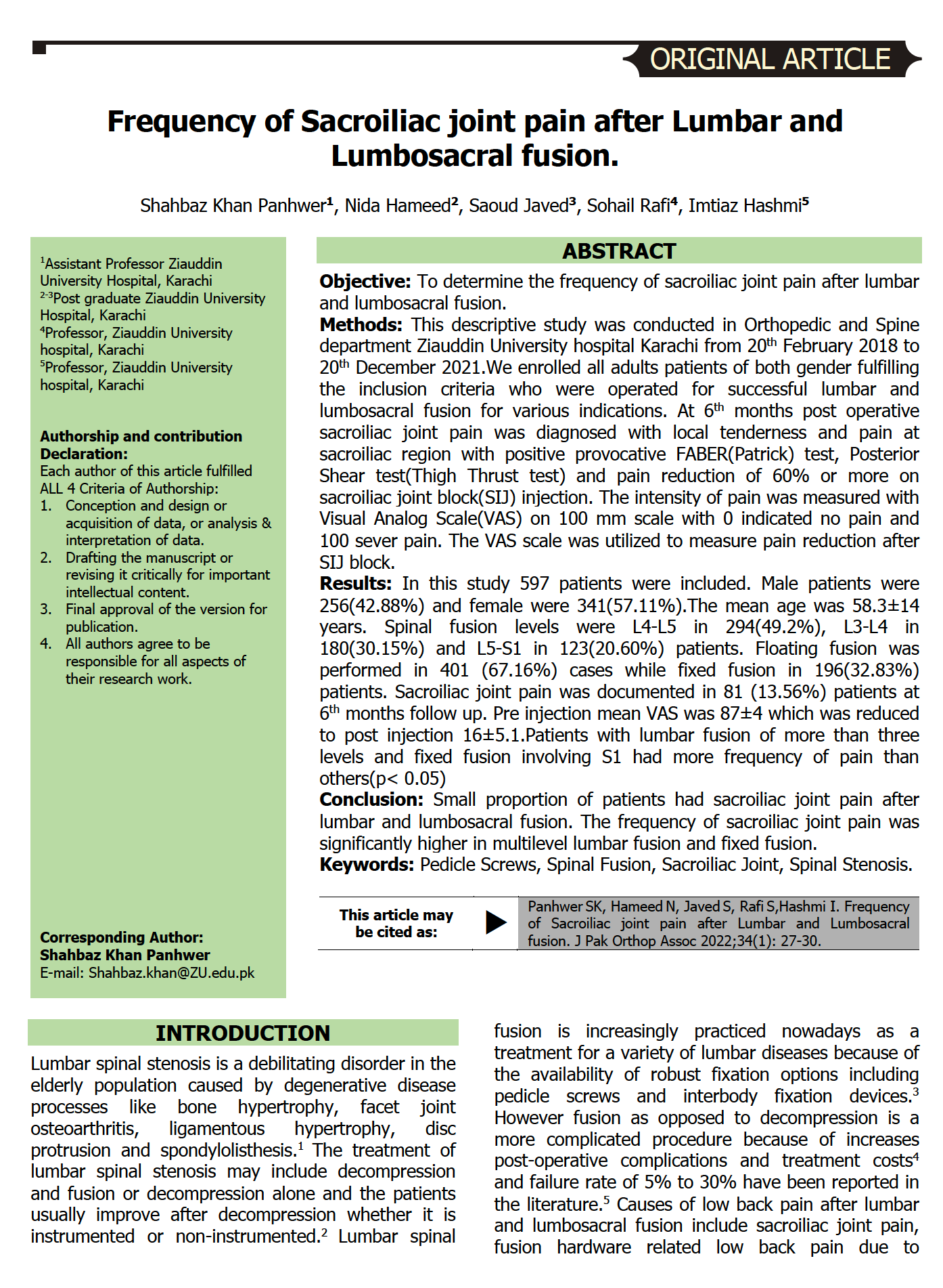 Results: 597 patients were included, 256(42.9%) were males and 341(57.1%) were females with mean age of 58.3 +/- 14 years. L4-L5 was most common involved segment in 49.1% cases followed by L3-L4 (30.5%) and L5-S1 (10.1%). Floating fusion was performed in 401 (67.2%) cases while fixed fusion was performed in 196(32.8%). Lumbar canal stenosis was most common diagnosis followed by LDH and spondylolisthesis. SIJ pain developed in 81 (13.6%) patients within 6-12 months in most of cases. Significant relationship was found between SIJ pain with more than 3 levels lumbar fusion (p-value=0.000), fixed fusion involving S1 (67/81 pts, p-value=0.000). No significant association was found between SIJ pain with age, gender, smoking, comorbidities, spinopelvic balance and degenerative scoliosis.