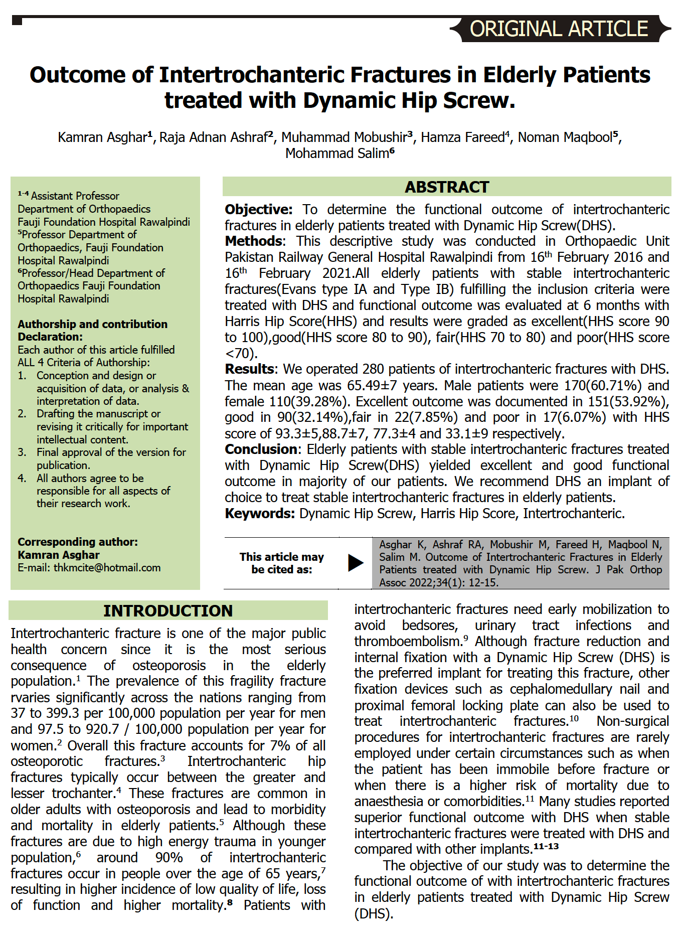 Baig N, Sahito B, Ahmed N, Mehboob G.Functional out come of dynamic hip screw fixation in intertrochanteric fracture.J Pak Orthop Assoc. 2014;26(2):31-35.