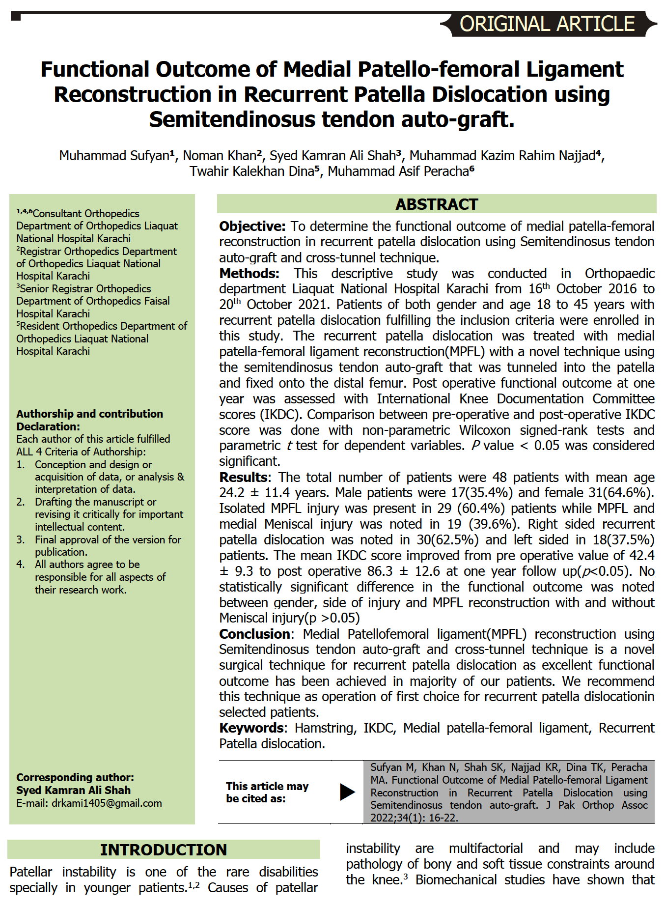 Functional Outcome of Medial Patello-femoral Ligament Reconstruction in Recurrent Patella Dislocation using Semitendinosus tendon auto-graft. (2022). Journal of Pakistan Orthopaedic Association, 34(01), 16-22. https://www.jpoa.org.pk/index.php/upload/article/view/616