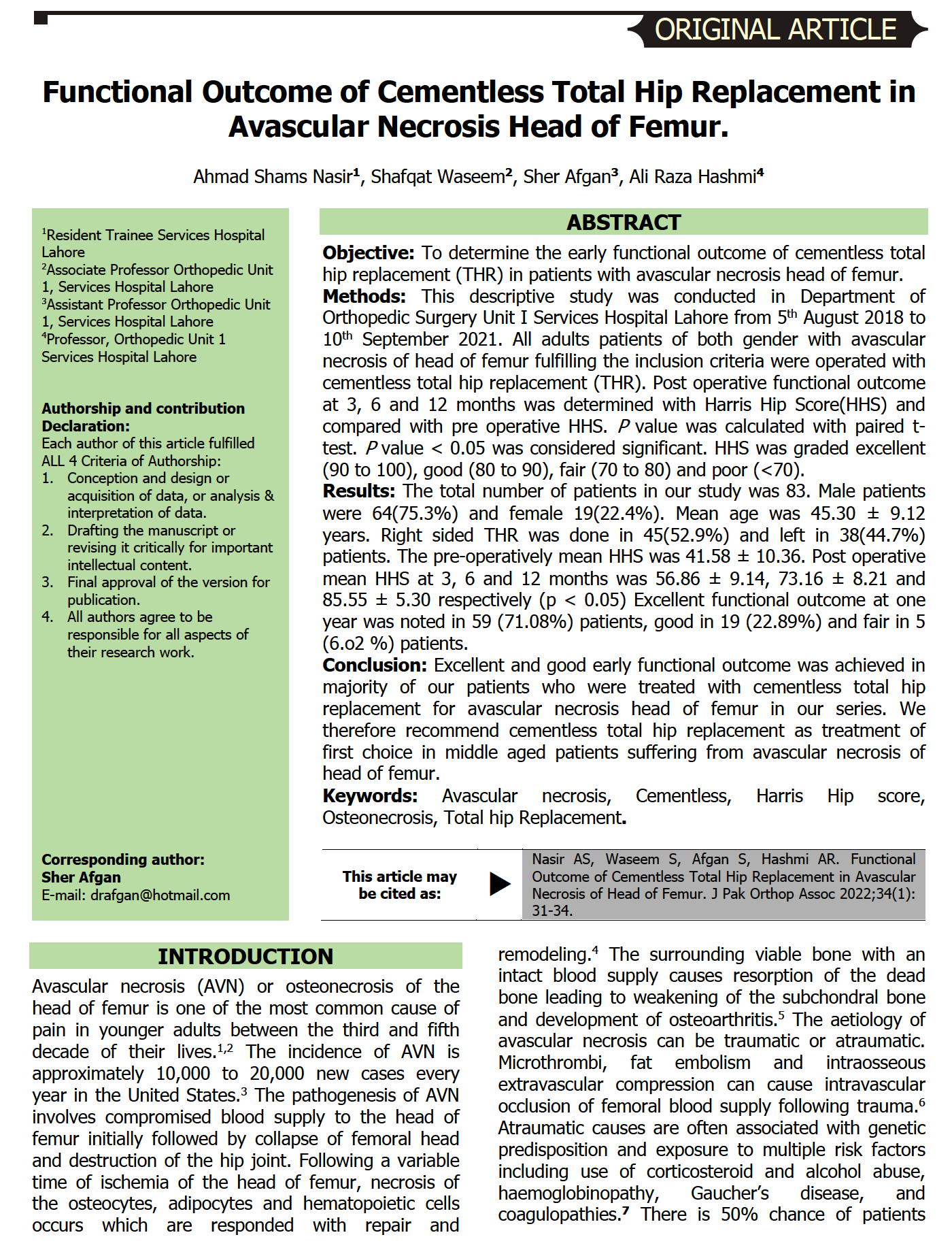 Karimi S, Kumar S, Ahmed F, Khalid A, Farooque U, Shahzeen F, et al. Functional Outcomes of Cementless Total Hip Arthroplasty in Avascular Necrosis of the Hip: A Prospective Study. Cureus.2020;12(8): e10136. doi:10.7759/cureus.10136.