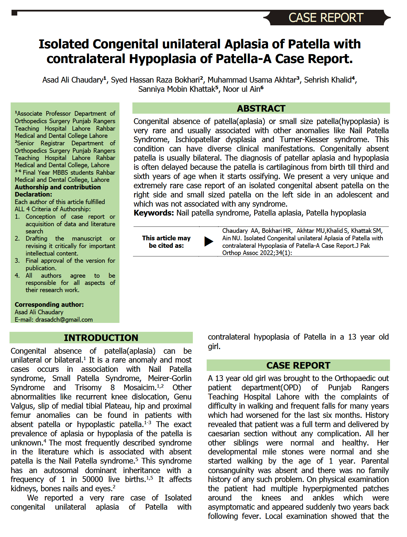 Isolated Congenital unilateral Aplasia of Patella with contralateral Hypoplasia of Patella-A Case Report.