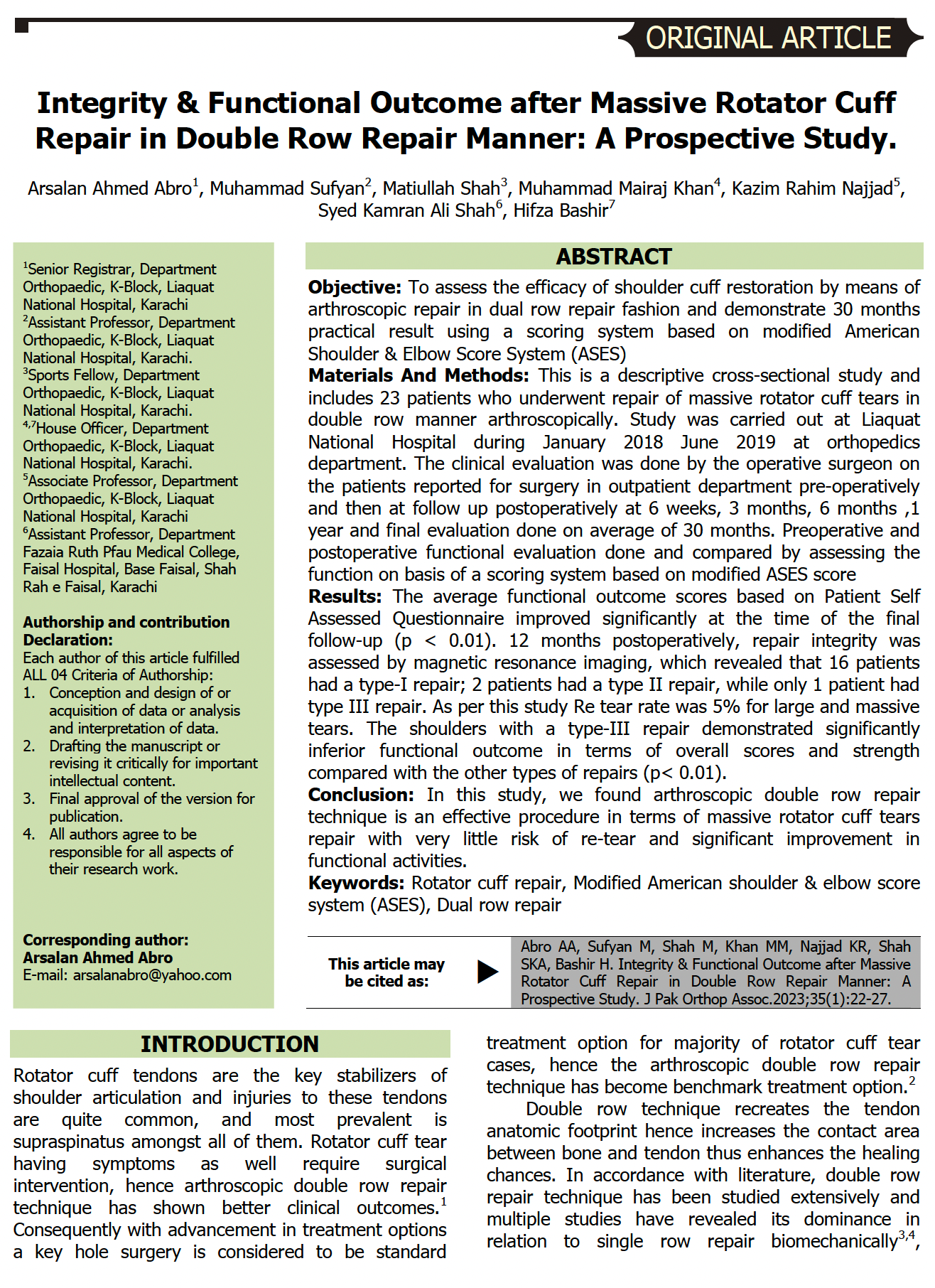 Integrity & Functional Outcome after Massive Rotator Cuff Repair in Double Row Repair Manner: A Prospective Study. (2023). Journal of Pakistan Orthopaedic Association, 35(01), 22-27. https://www.jpoa.org.pk/index.php/upload/article/view/625