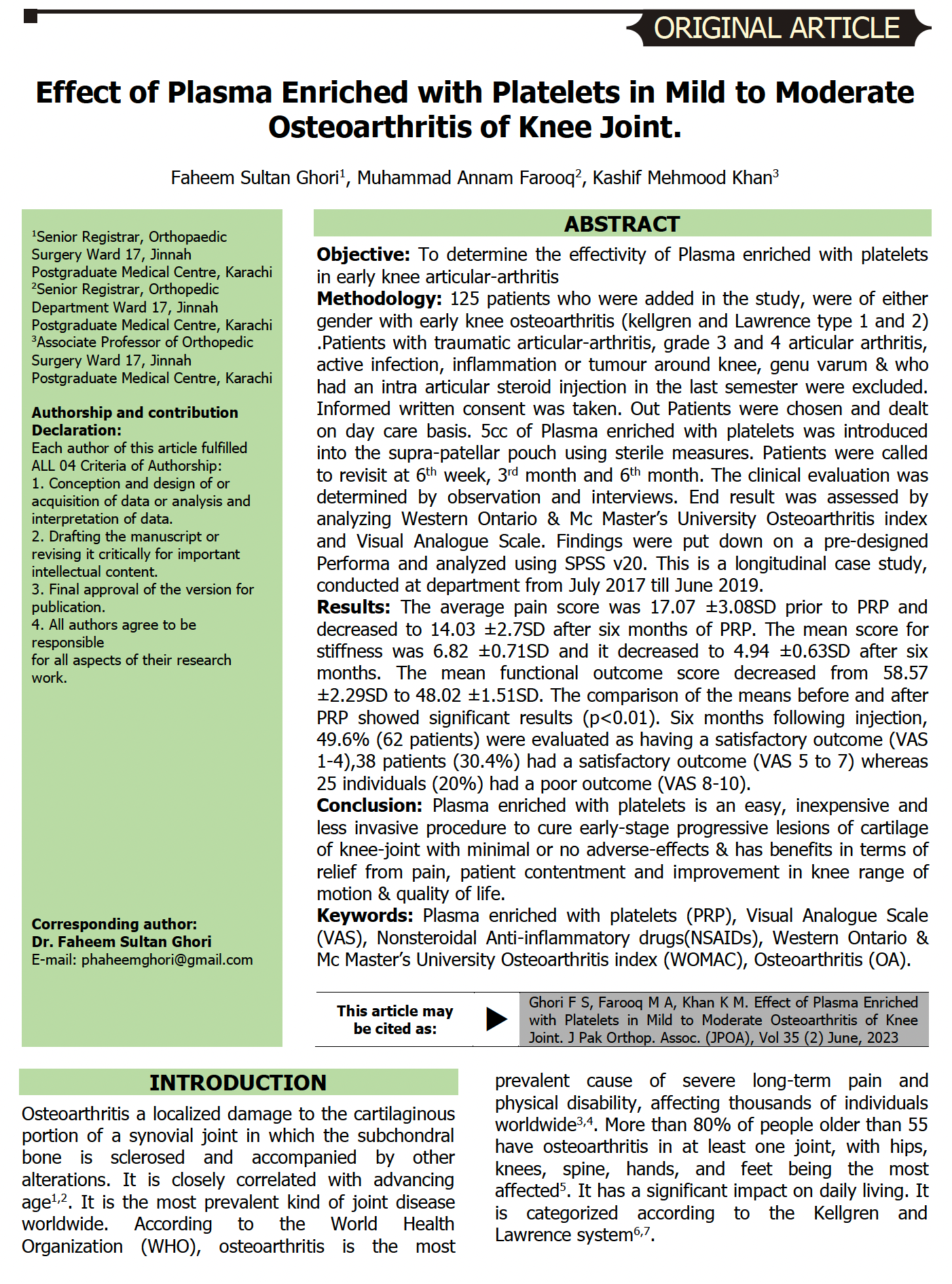 Effect of Plasma Enriched with Platelets in Mild to Moderate Osteoarthritis of Knee Joint. (2023). Journal of Pakistan Orthopaedic Association, 35(2), 23-28. https://www.jpoa.org.pk/index.php/upload/article/view/629