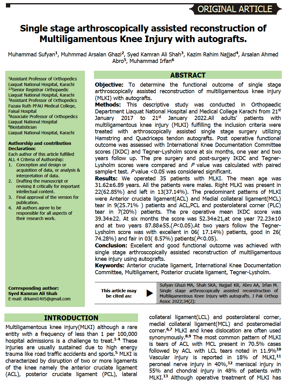 Methods: This descriptive study was conducted in Orthopaedic Department Liaquat National Hospital and Medical College Karachi from 21st January 2017 to 21st January 2022.All adults’ patients with multiligamentous knee injury (MLKI) fulfilling the inclusion criteria were treated with arthroscopically assisted single stage surgery utilizing Hamstring and Quadriceps tendon autografts. Post operative functional outcome was assessed with International Knee Documentation Committee scores (IKDC) and Tegner-Lysholm score at six months, one year and two years follow up. The pre surgery and post-surgery IKDC and Tegner-Lysholm scores were compared and P value was calculated with paired sample-t test. P value <0.05 was considered significant.