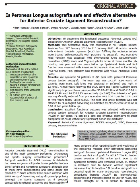 Methods: This descriptive study was conducted in AO Hospital Karachi Pakistan from 21st January 2020 to 21st January 2022. All adults patients with Anterior Cruciate Ligament (ACL) tear fulfilling the inclusion criteria were treated arthroscopically with ipsilatera PL autograft. Post operative knee function was assessed with International Knee Documentation committee (IKDC) score and Tegner-Lysholm score at three months, six months, one year and two years follow up. Ipsilateral Ankle and foot function was assessed with American Orthopaedic Foot and Ankle Society (AOFAS) score. Pain intensity was measured with Visual Analogue Scale (VAS).