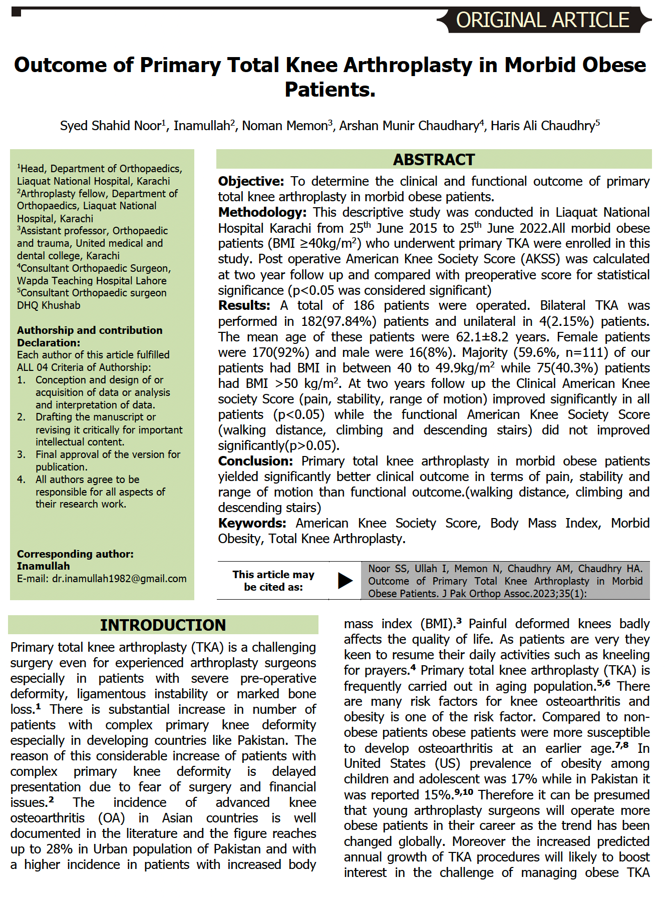 • Inamullah Arthroplasty fellow, Department of Orthopaedics, Liaquat National Hospital, Karachi Author