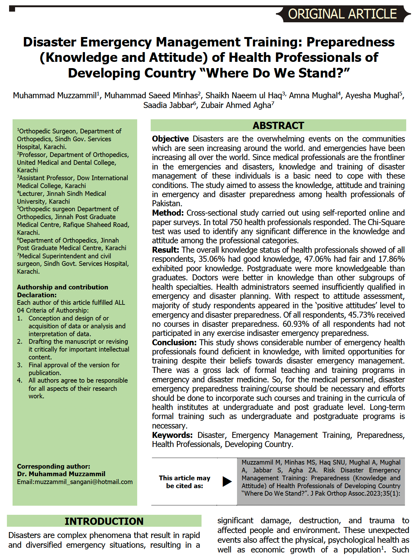 Objective Disasters are the overwhelming events on the communities which are seen increasing around the world. and emergencies have been increasing all over the world. Since medical professionals are the frontliner in the emergencies and disasters, knowledge and training of disaster management of these individuals is a basic need to cope with these conditions. The study aimed to assess the knowledge, attitude and training in emergency and disaster preparedness among health professionals of Pakistan.