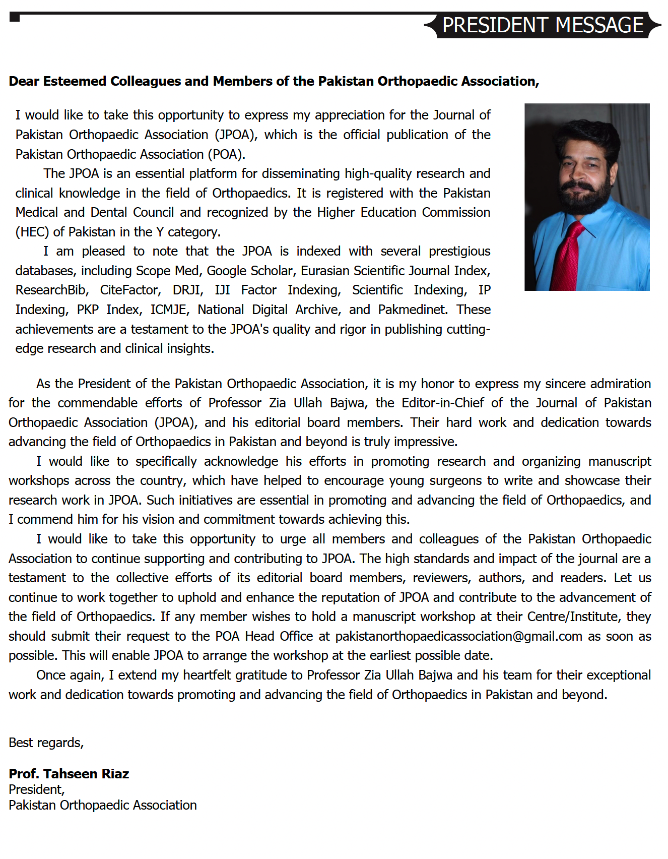 As the President of the Pakistan Orthopaedic Association, it is my honor to express my sincere admiration for the commendable efforts of Professor Zia Ullah Bajwa, the Editor-in-Chief of the Journal of Pakistan Orthopaedic Association (JPOA), and his editorial board members. Their hard work and dedication towards advancing the field of Orthopaedics in Pakistan and beyond is truly impressive.