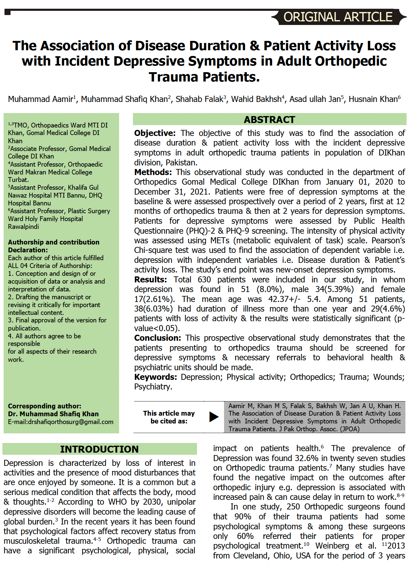 The Association of Disease Duration & Patient Activity Loss with Incident Depressive Symptoms in Adult Orthopedic Trauma Patients. (2023). Journal of Pakistan Orthopaedic Association, 35(2), 19-22. https://www.jpoa.org.pk/index.php/upload/article/view/766