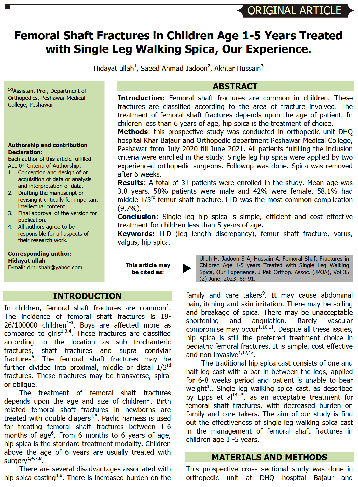 Mehmood MS, Shah S, Razzaq S, Karim, A, Haq AU, Sabour A. Frequency of limb shortening in femoral shaft fractures treated by hip spica casting in children in Tertiary Care Hospital. Professional Med J 2019; 26(11):1873-1877. DOI: 10.29309/TPMJ/2019.26.11.3048.