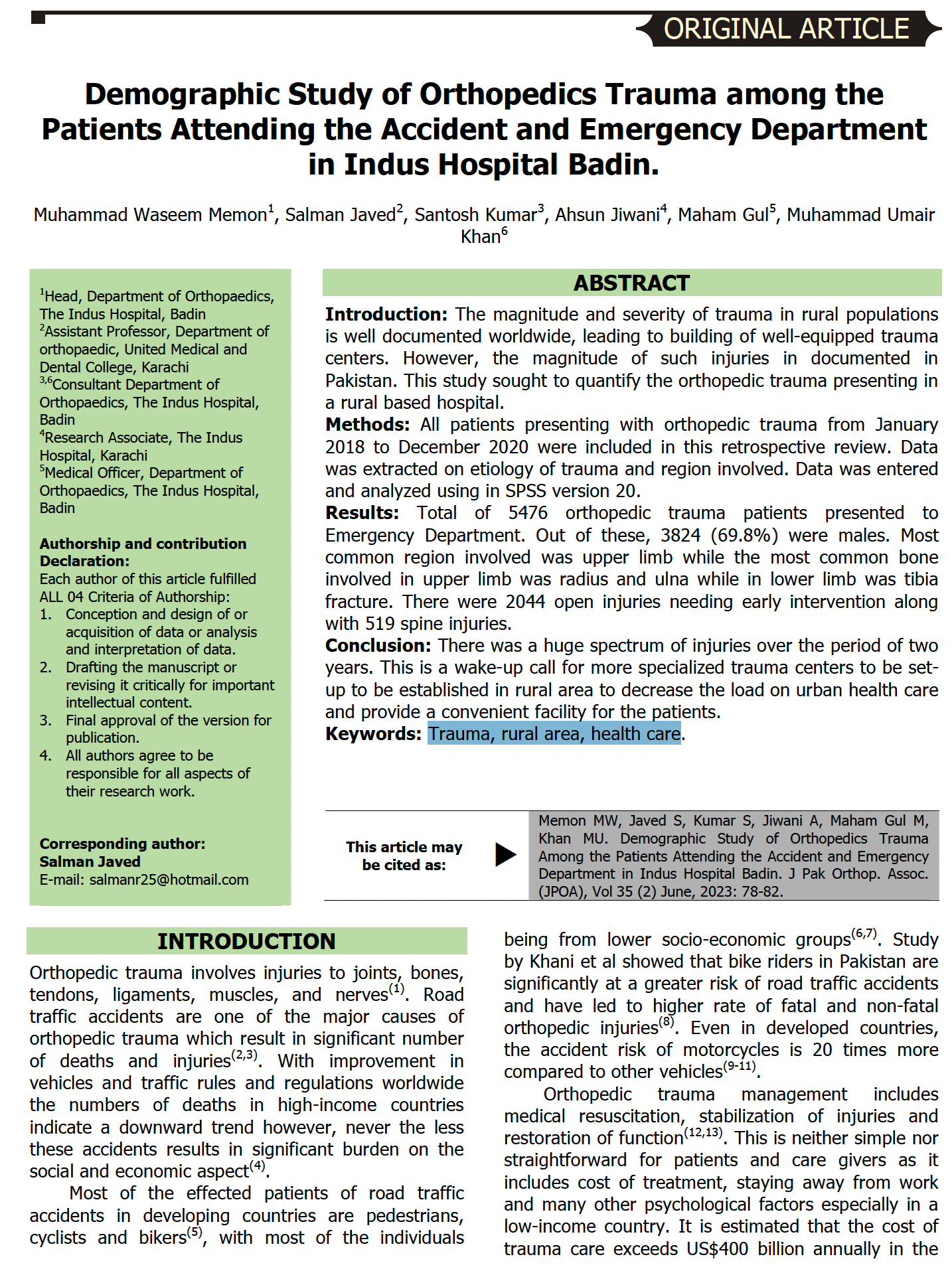 Demographic Study of Orthopedics Trauma Among the Patients Attending the Accident and Emergency Department in Indus Hospital Badin.